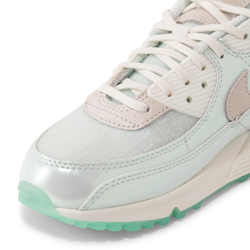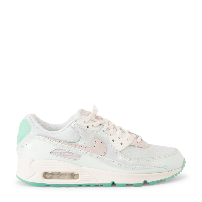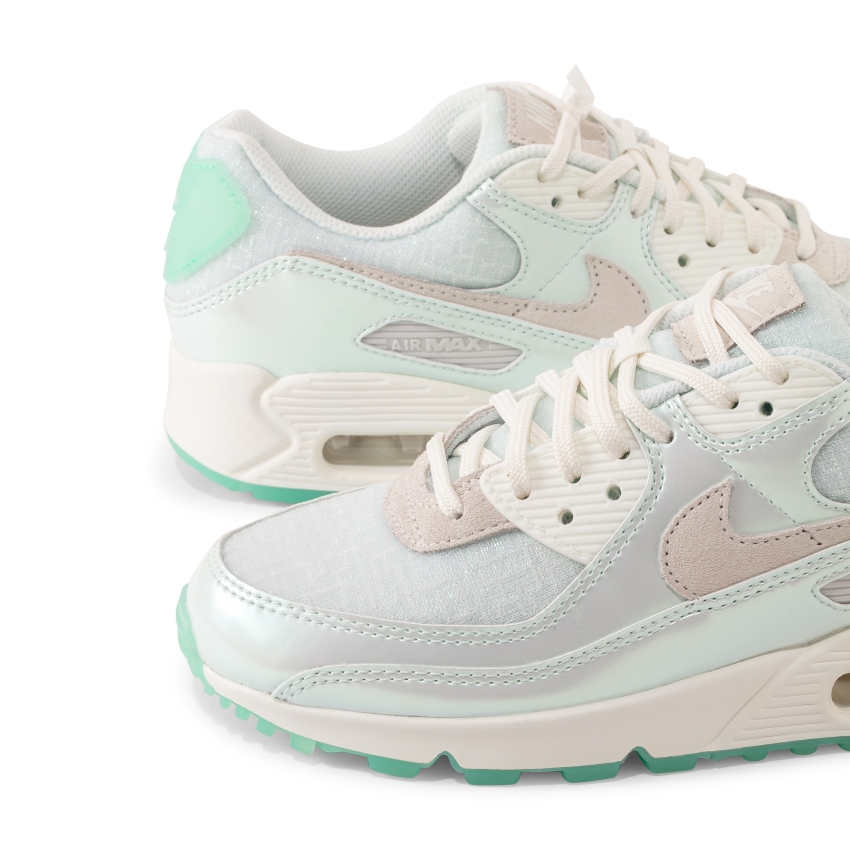 يُطرح الحذاء الرياضي "إير ماكس 90" من نايكي بحلة بألوان الأبيض والبنفسجي الفاتح "لايت فيوليت" و"سيل" والأبيض "ساميت". ويأتي بجزء علوي بنسج براق مع تداخلات بلمعة ألوان الطيف وواقيات من الطين، إلى جانب خامة الشامواه على غطاء منطقة الأصابع واللسان وشعارات سووش الشهيرة. ويتمتع بأربطة بيضاء للإغلاق وقطع بلاستيكية، ونعل وسطي بكعب أخضر ونعل خارجي شفاف مزين بشعار سووش الشهير من نايكي بتصميم شفاف ذي مظهر براق.