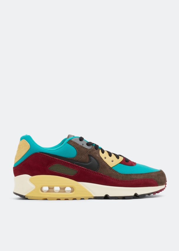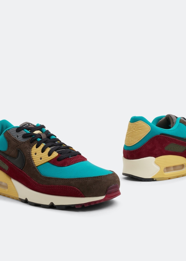 يأتي سنيكرز إير ماكس 90 المميز من نايك بتصميم مقسم باللون الأسود والأخضر التربو والريدجروك والذهبي الساترن. مصنوع من النسيج الشبكي مع طبقات من الشمواه ويمتاز بشعار نايك من الجلد على الجوانب ولسان شبكي بشعار العلامة بتصميم ريترو. يكتمل التصميم بأربطة بيضاء ونعل أوسط ونعل خارجي شبه شفاف.