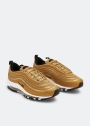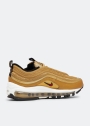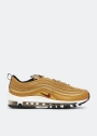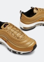 تُقدم نايك سنيكرز إير ماكس 97 بلون "جولد بوليت" مع بنية من النسيج الشبكي وطبقات من الجلد. يتميز الحذاء بتفاصيل عاكسة من مادة "إم 3"، نعل أوسط باللون الأبيض، تصميم مموج، وحدة "إير ماكس"، تفصيل شعار السووش الشهير ونعل خارجي مطاطي باللون الأسود.