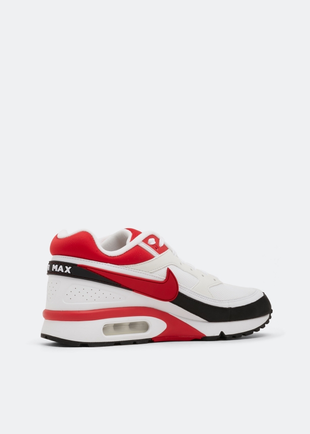 يأتي سنيكرز اير ماكس بي دبليو بمزيج من النسيج الشبكي والجلد باللون الأبيض مع اللونين الأحمر والأسود. يأتي بقاعدة باللون الأبيض مع واقيات طين باللون الأسود وتفاصيل باللون الأحمر بالإضافة إلى علامة "إير" مرئية على الكعب ونعل خارجي مطاطي.