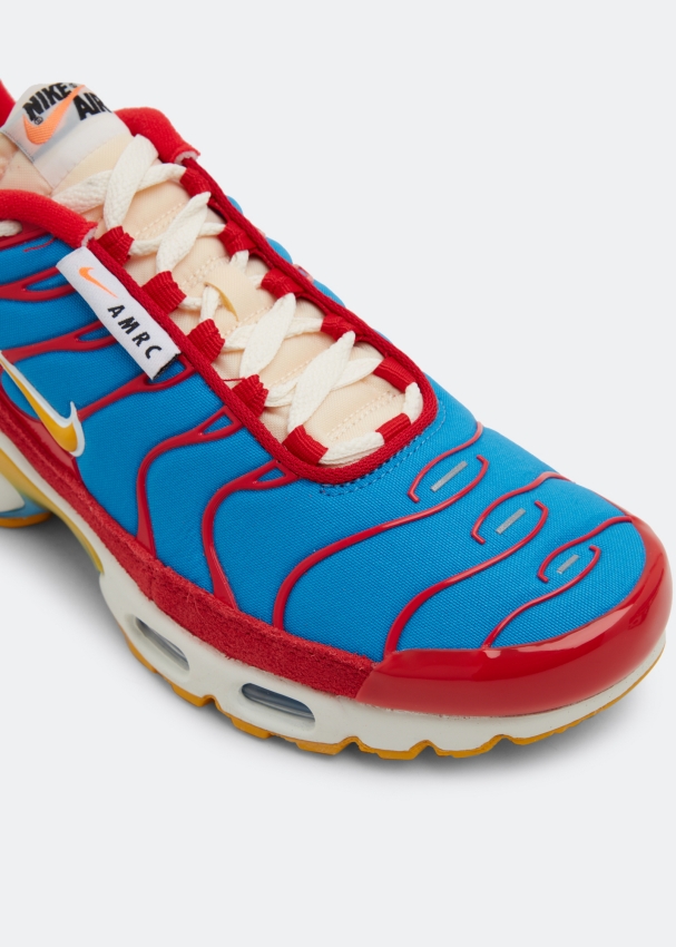 يتميز سنيكرز إير ماكس بلس إس إي 'إيه إم آر سي' من نايك بتصميم كتصاميم إير ماكس السابقة عالية الأداء، ويتمتع بشعار العلامة بنمط كلاسيكي وطابع ألوان مستوحى من الطراز القديم. يتميز هذا الزوج بقاعدة لايت فوتو بلو مع تصميم قفصي باللون الأحمر يونفيرستي ريد، وتراكبات واقيات الطين بلمسات متباينة باللون الأصفر وملصق جانبي بشعار "إيه إم آر سي" فوق نعل أوسط أبيض ونعل خارجي أصفر من المطاط.